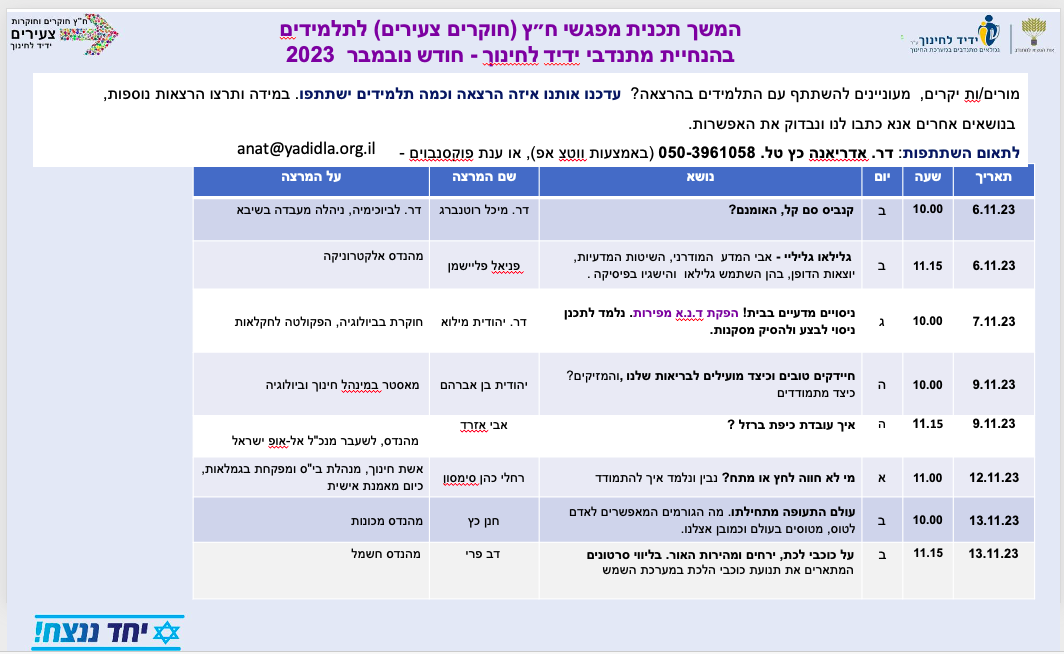 עכשיו, בתקופת המלחמה, זה השבוע הרביעי, הם יוצרים ומפרסמים בכל שבוע רשימה של הרצאות. שתיים ביום שני, שתיים ביום חמישי, ובימי שלישי, מספרת אדריאנה, עושים ניסויים – הכל דרך הזום. "לקראת הניסויים התלמידים מקבלים רשימת מצרכים שעליהם להכין, ויחד עושים את הניסוי בזום. בדרך גם מדברים על איך מתכננים ניסוי, מדברים על התהליך ועל התוצאה. לפני שבוע למשל, ערכנו ניסויים פיזיקליים בנוכחות פיזיקאי שנתן הסבר על הניסוי".