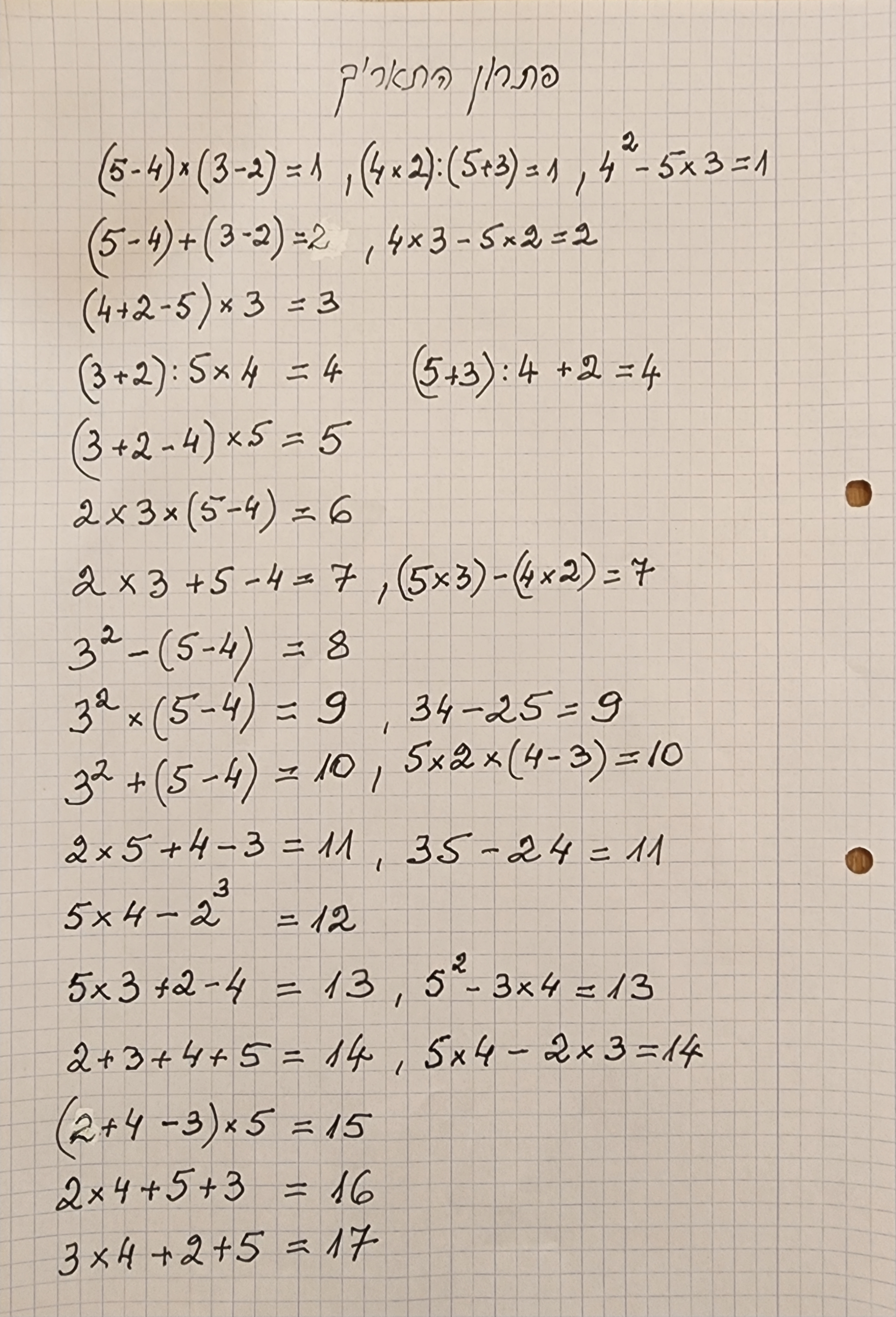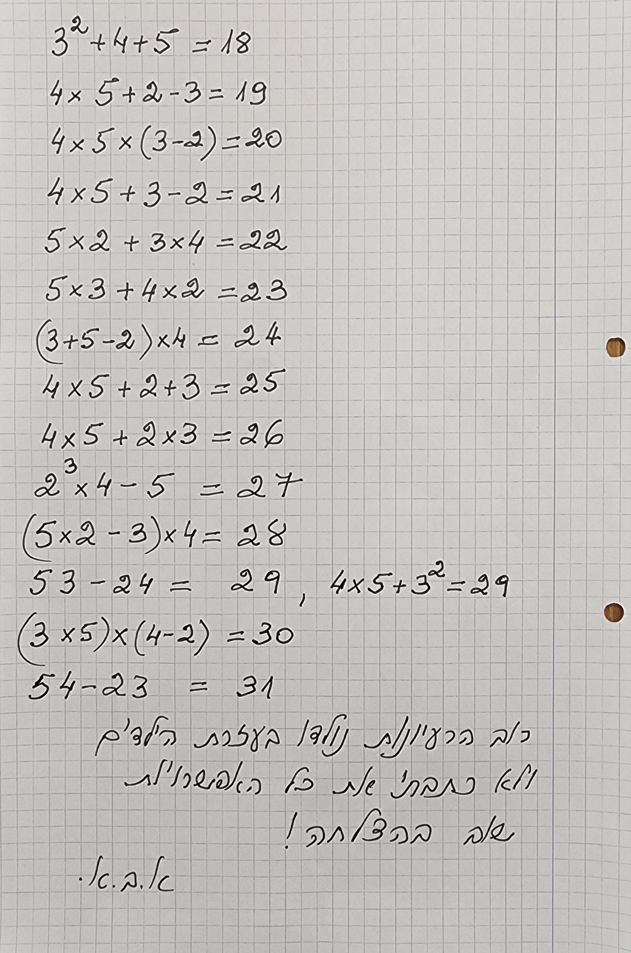 נ.ב. לכל מספר אפשר לבנות יותר מתרגיל אחד. כמובן, ניצלתי זאת תוך לימוד פעולות נוספות כמו, חזקה שורש ועצרת.