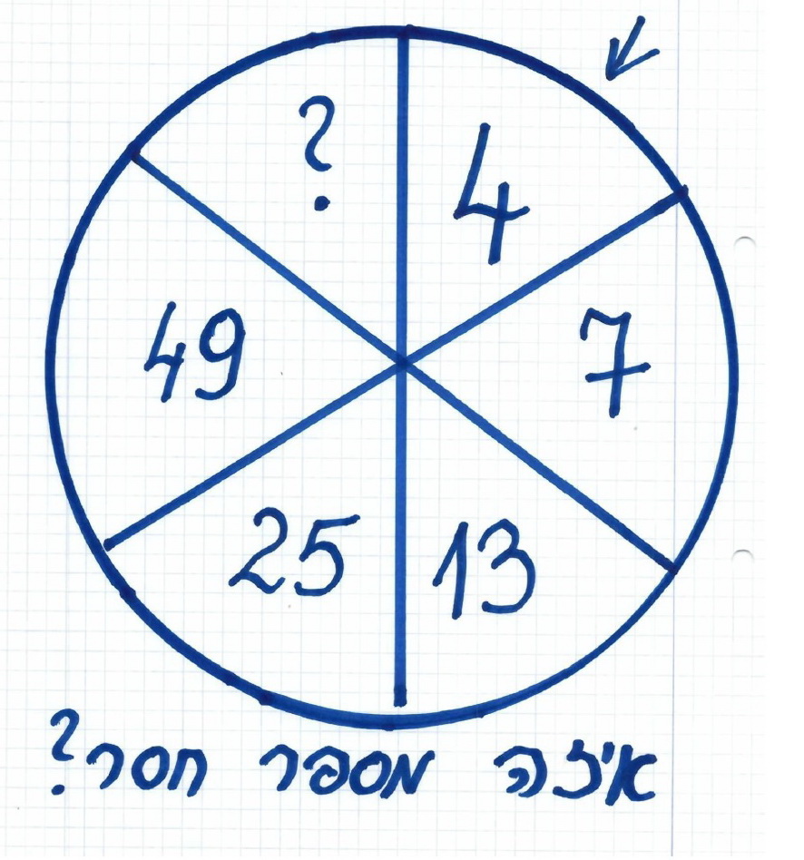 הסבר: מתחילים בגזרה בה רשום 7 ומתקדמים עם כיוון השעון. המספר הבא הוא המספר הרשום בגזרה ועוד פעמיים ההפרש בינו לבין הגזרה הקודמת.