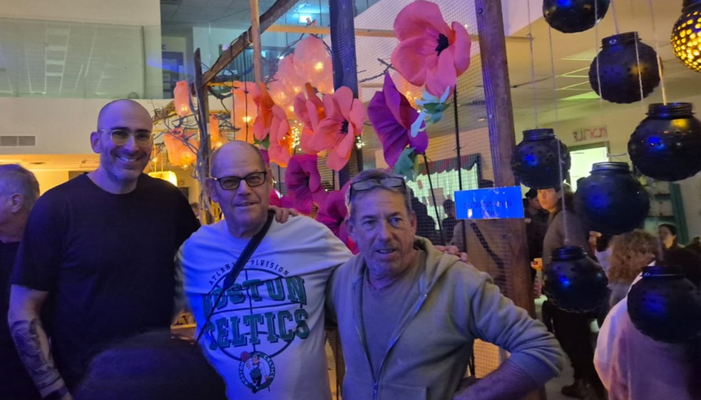 | מימין לשמאל: מיכה המורה לאומנות, אמנון המתנדב שלנו משהם ועומר נאור מנהל ביה'ס "שחף" על רקע תערוכת חנוכה. |